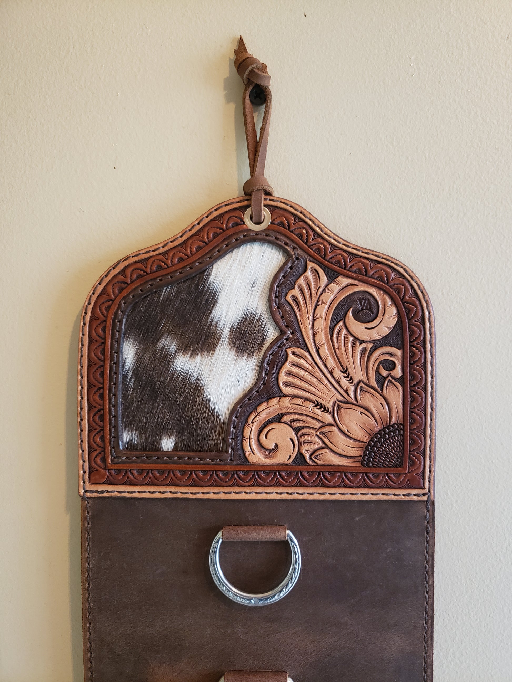 Handmade tooled leather wild rag holder, scarf rack, sunflower and cowhide inlay