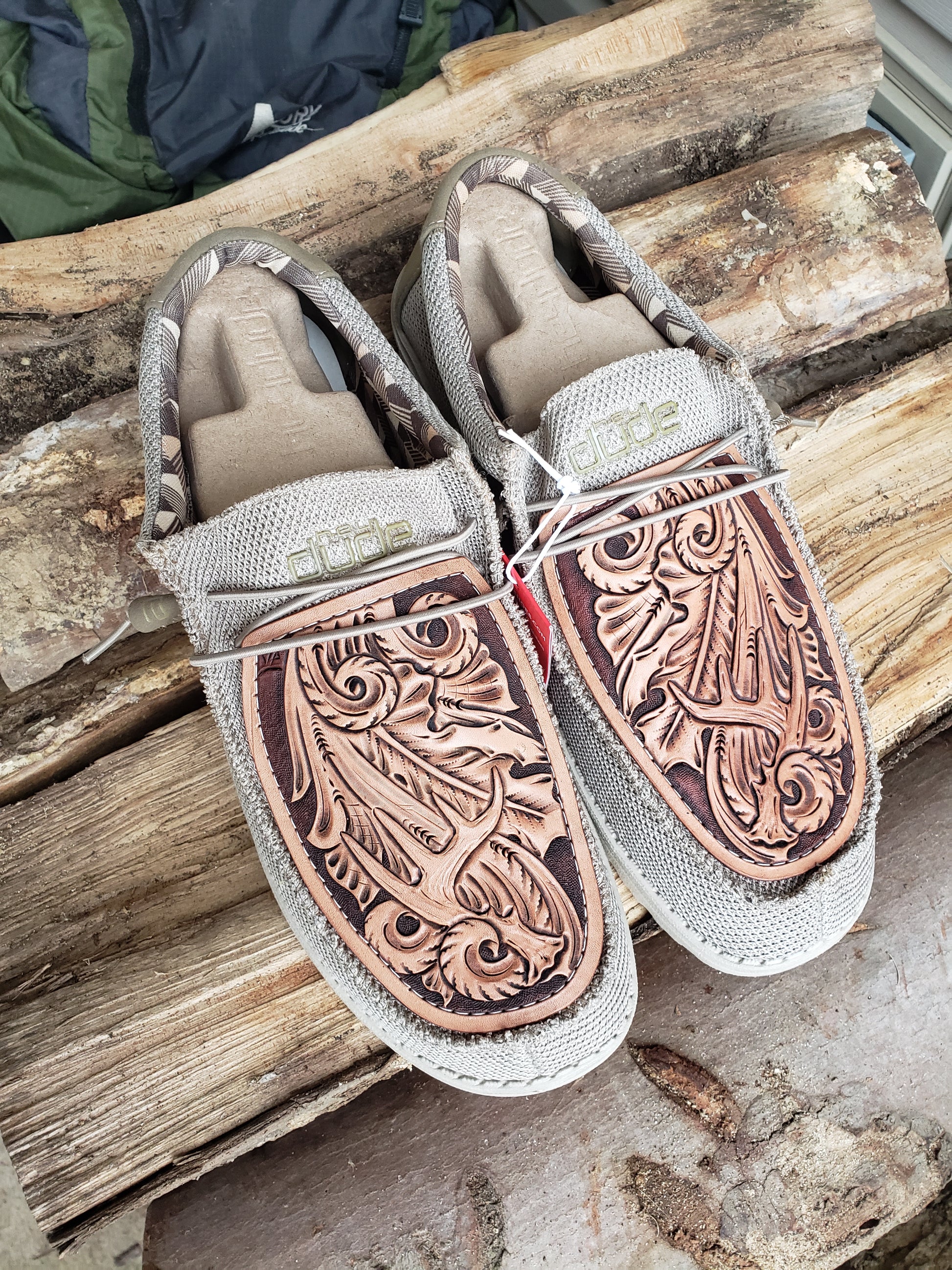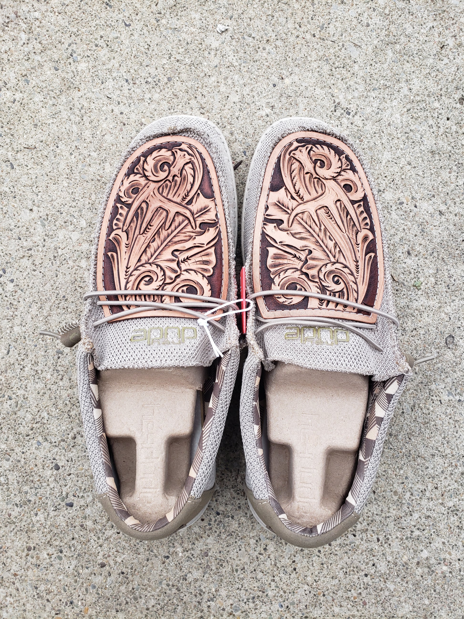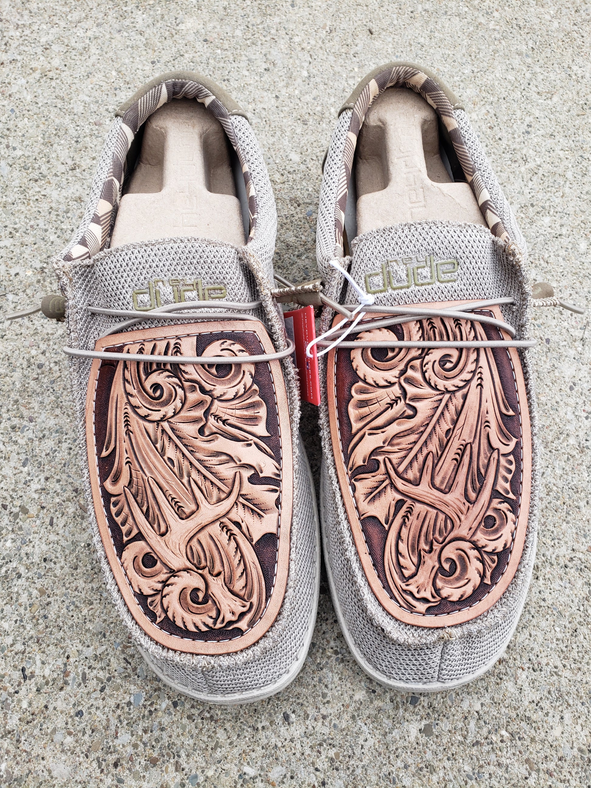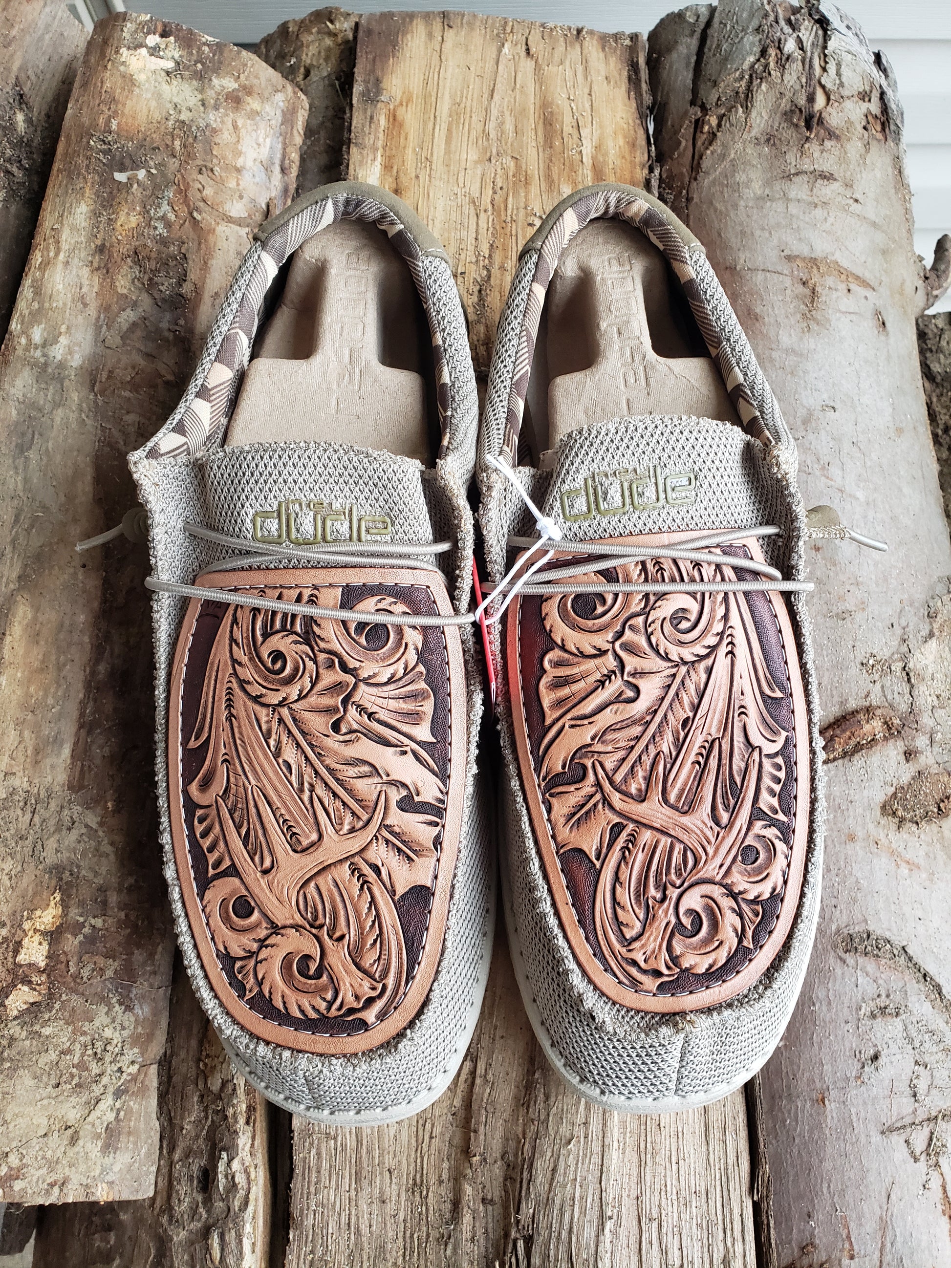 Patches are tooled with oak leaf floral scrolling and a whitetail antler.