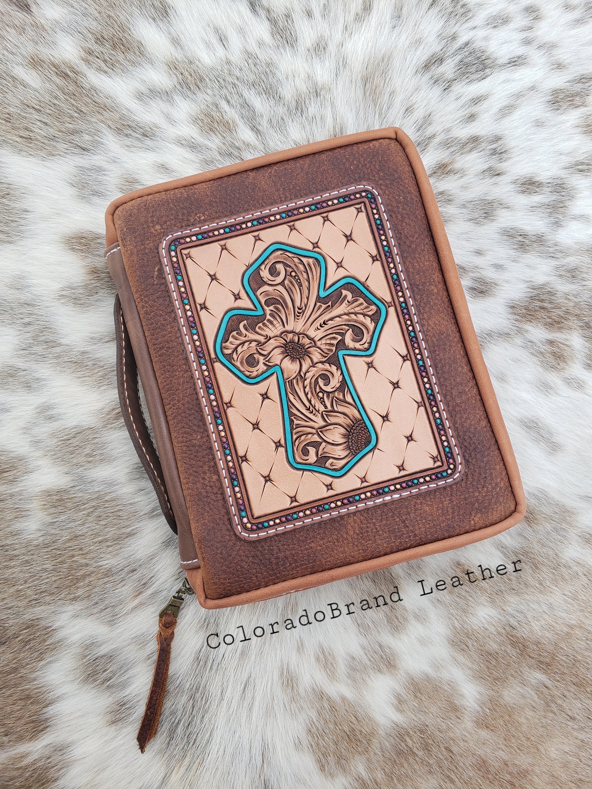 The body of the case is brown chrome tan leather. The front has a tooled portion with a sunflower floral cross, turquoise cross border, quilted background, and a colorful beaded border.